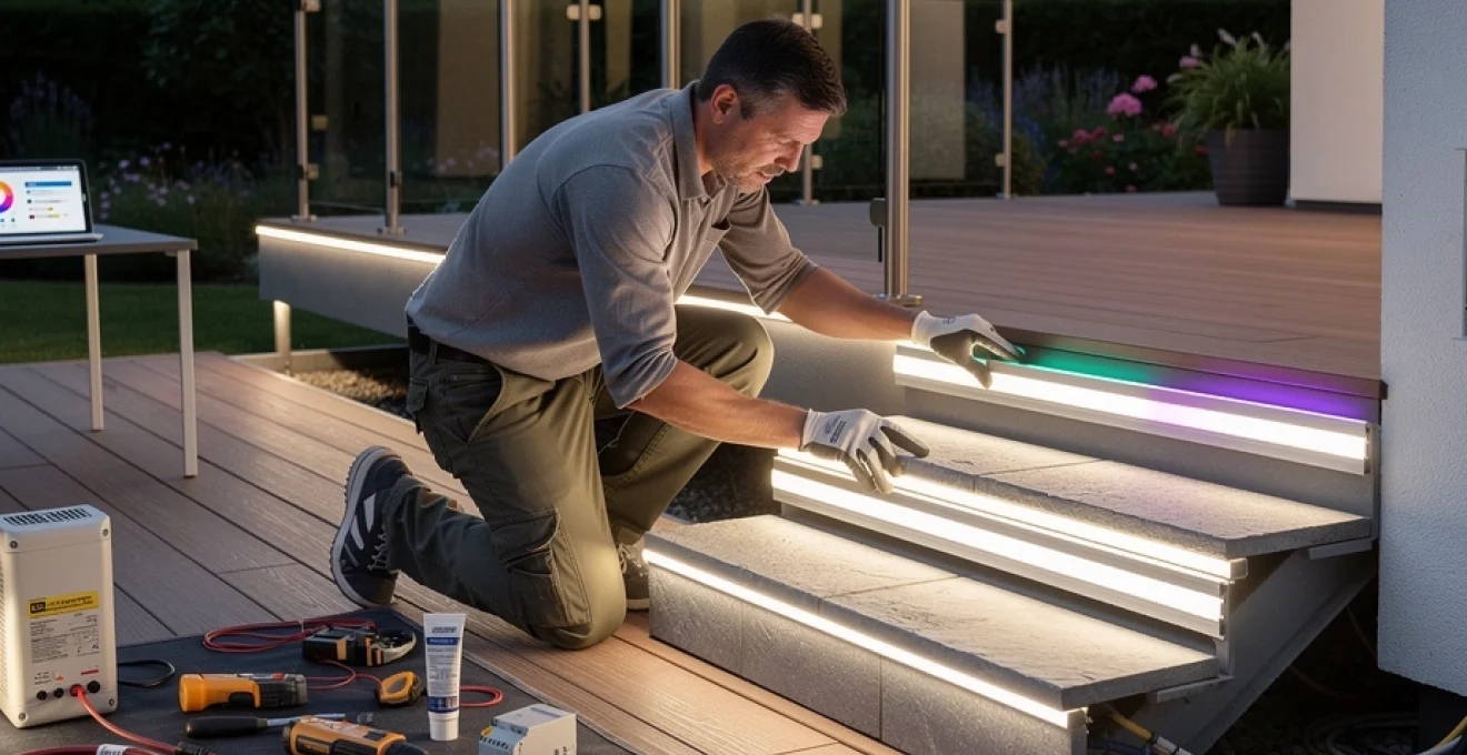 On peut comparer le profilé aluminium à un châssis de voiture : il apporte la rigidité et la protection nécessaires, tandis que le ruban LED en est le moteur. Selon la configuration de votre terrasse, plusieurs techniques de pose coexistent : encastrement dans des profilés pour les sols, fixation directe sur dalle béton pour les périphéries, montage sous margelles de piscine ou sous garde-corps pour des effets d’éclairage indirect. Chacune de ces solutions implique des méthodes de vissage, de collage et de protection adaptées afin d’assurer à la fois l’esthétique et la durabilité.