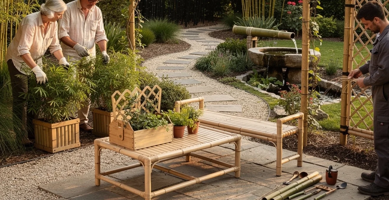 Dans une approche écologique, on privilégiera des meubles en bambou massif issu de filières certifiées, ou réalisés à partir de cannes récoltées localement lorsque cela est possible. Un simple banc en bambou placé sous un arbre, un treillage vertical pour des clématites ou des haricots à rames, ou encore une série de jardinières alignées le long d’un mur suffisent à donner une identité forte à l’espace. Pour prolonger la durée de vie de ce mobilier, un entretien annuel à l’huile de lin ou à la cire végétale permettra de nourrir la matière et de la protéger de l’humidité.